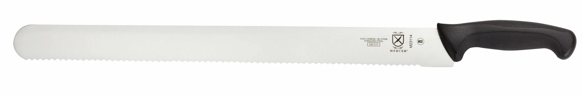 For making horizontal cake layers, reach for Mercerās Millennia 18ā Wavy Edge Cake Slicer to slice cleanly and evenly. At 18ā long, this slicer is long enough to handle large round and rectangle cakes. The serrated edge slices gently, without tearing so layers go back together neatly. Itās made of the highest-quality Japanese steel so it keeps a razor-sharp edge, and it has an ergonomic handle that makes using it comfortable. The handle is made of a combination of SantopreneĀ® for comfort and polypropylene for durability and it has textured finger points that provide slip-resistance, grip, and safety. With NSF-certification and a limited lifetime warranty, this knife doesnāt disappoint!