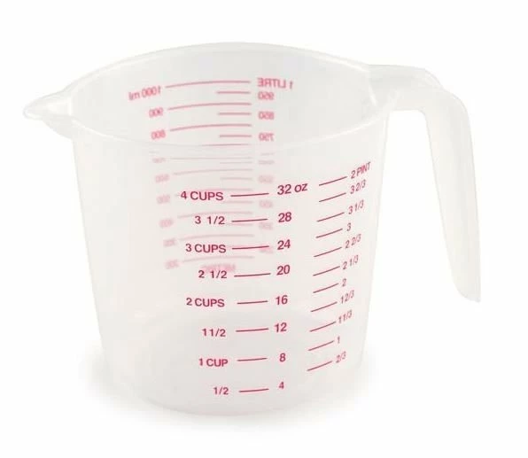 Pour your ingredients more precisely than ever before with the Plastic 4-Cup Measuring Cup by Norpro. This clear measuring cup’s design incorporates durable, food-safe plastic that has a large, comfortable handle for easy handling and a small pour spout for mess-free, exact pouring. This makes it ideal for filling up a pot, pan, or any other cookware or bakeware with liquid or dry ingredients. It’s even effective at possibly watering indoor plants, holding candy, and more. Get the Norpro Plastic 4-Cup Measuring Cup today and prevent the possibility of spilling any batter for you to have to clean up later!