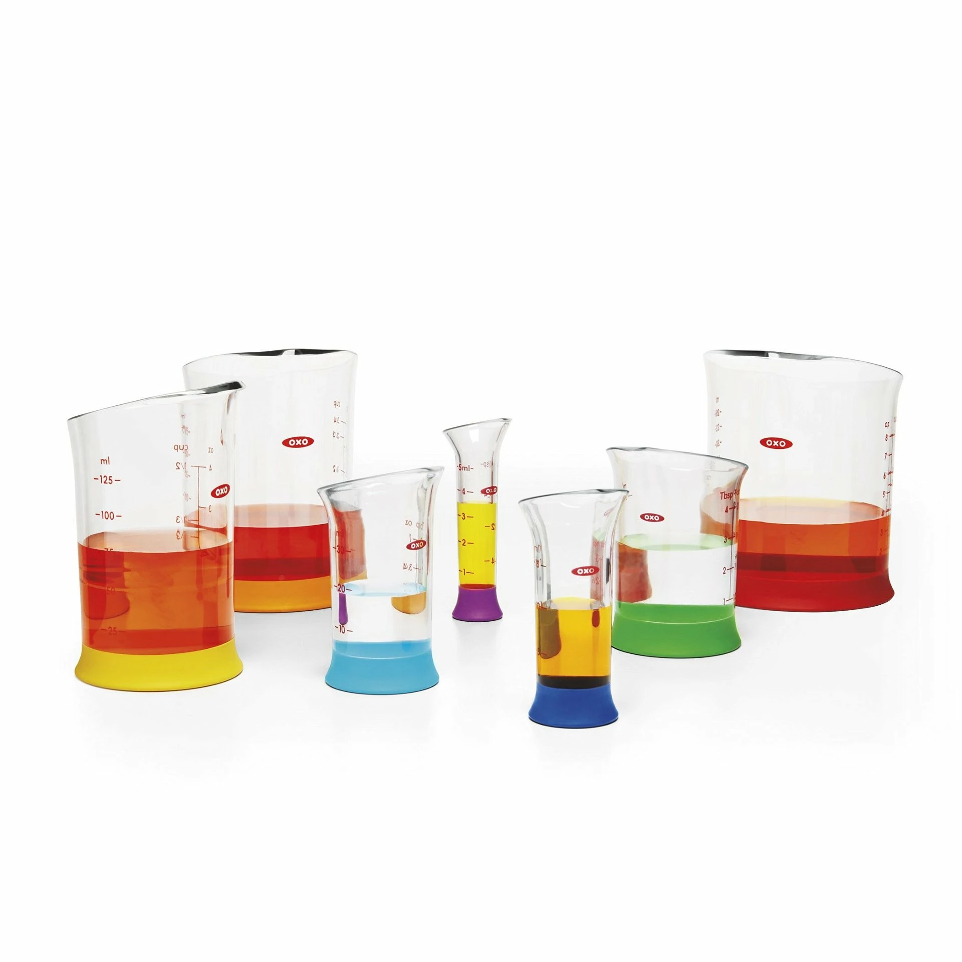 Complex baking recipes may require numerous ingredients mixed in various ways, and what better way to be prepared than with the OXO 7pc Liquid Measuring Beaker Set? These beaker-shaped measuring cups have a sturdy base, so you can fill them with the various ingredients your recipe demands and add them into your mixture as needed. Designed with a pour spout, you can measure things more precisely, and add each ingredient without making a mess. Add these quirky, durable measuring cups to your kitchen arsenal and enjoy efficient mixing for your most complicated baking adventures.