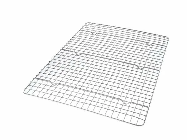 Save your freshly-baked cookies from soggy bottom with this XL Baking Rack by USA Pan! The 6 raised feet on this steel rack elevate your baked goodies and promote air flow and uniform cooling, preventing condensation from collecting underneath. The cross-wire weave holds smaller items securely so they won’t crumble or fall through the grate.
